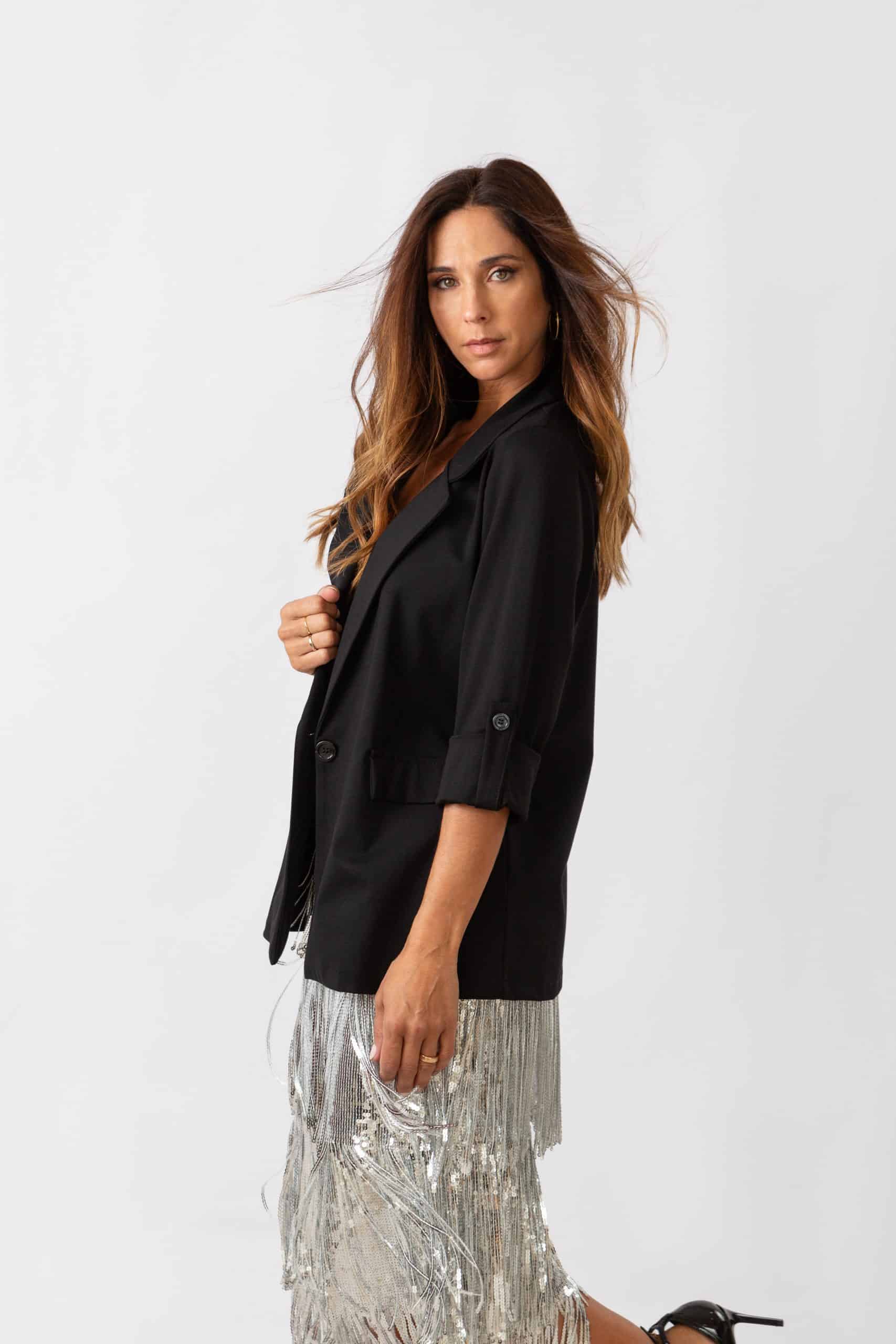 Es el blazer perfecto para las noches que merecen brillar tanto como tú.