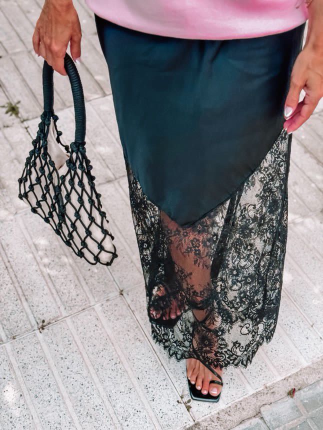 Una pieza icónica que combina la suavidad de la seda con la delicadeza del encaje, creando un diseño único y sofisticado. Esta falda de talla única está pensada para realzar la belleza y comodidad de cualquier silueta, adaptándose perfectamente hasta una talla 42 gracias a su diseño flexible y su corte cuidadosamente elaborado.