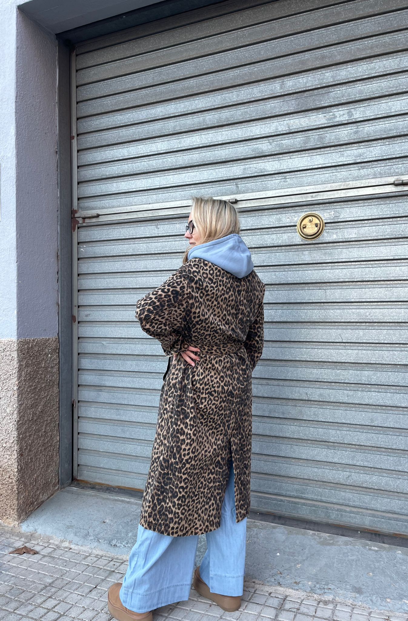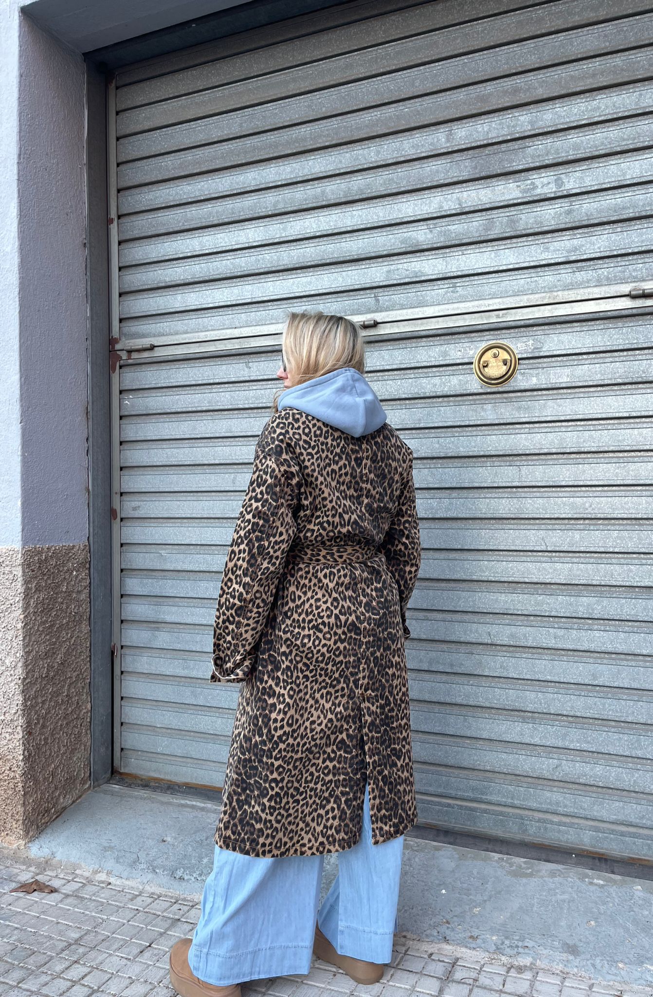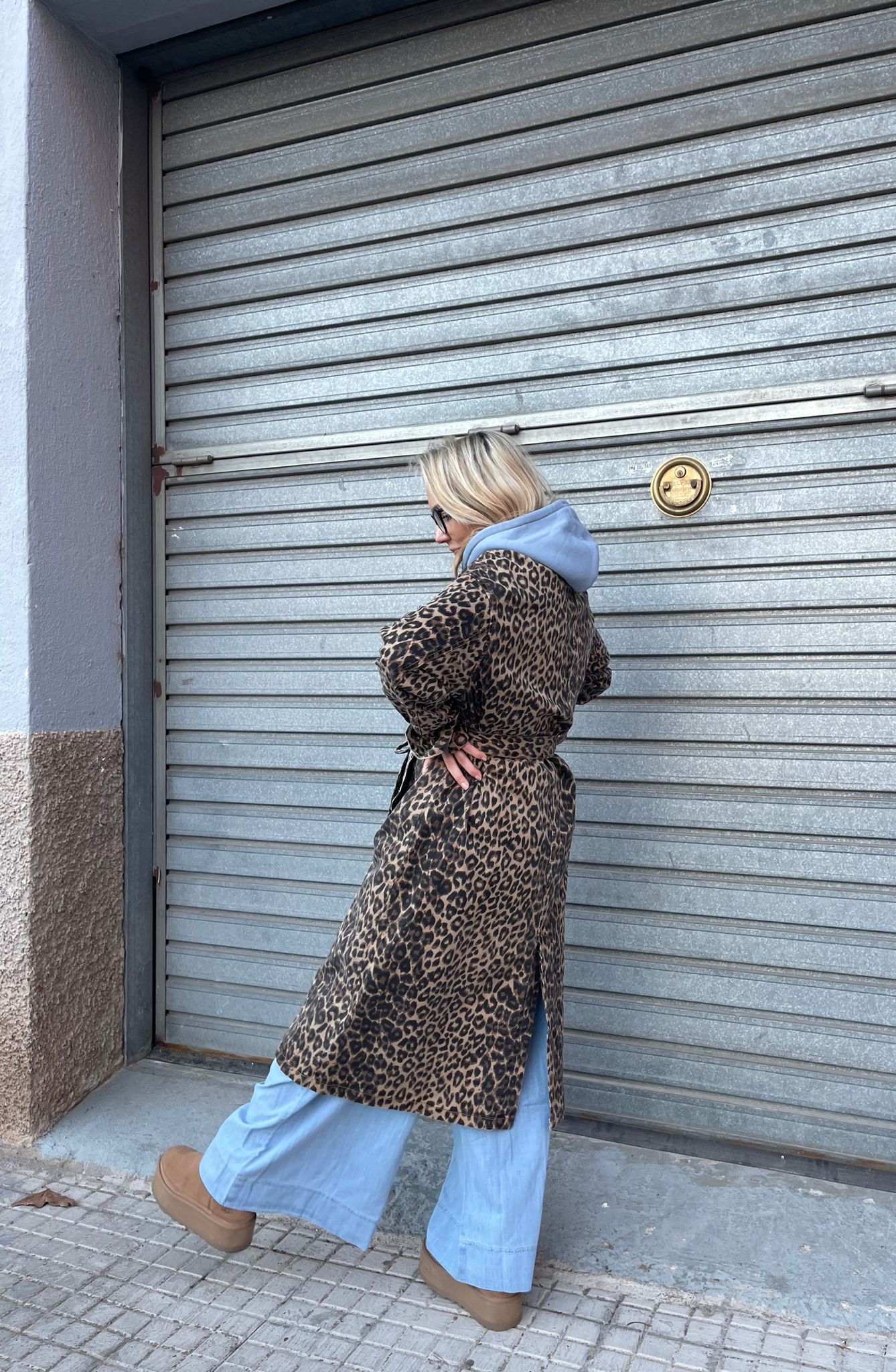 Esta gabardina de animal print en denim es una pieza única y atemporal que no puede faltar en tu fondo de armario. Su diseño oversize, adaptable de la talla XS a la XL, brinda comodidad y un estilo relajado sin perder elegancia. El estampado animal print añade un toque audaz y sofisticado, mientras que el tejido denim la hace versátil y resistente.