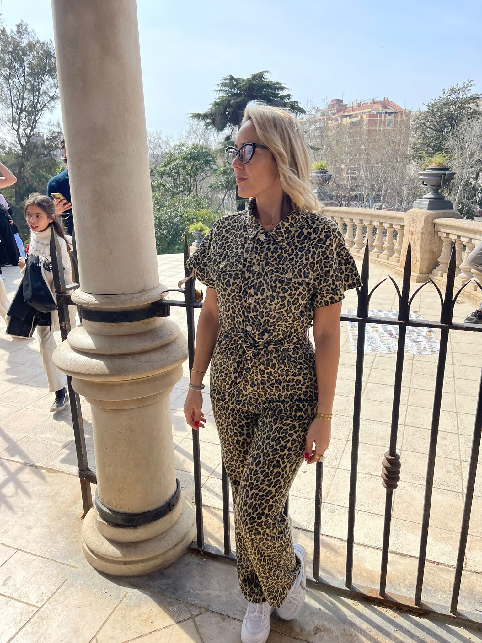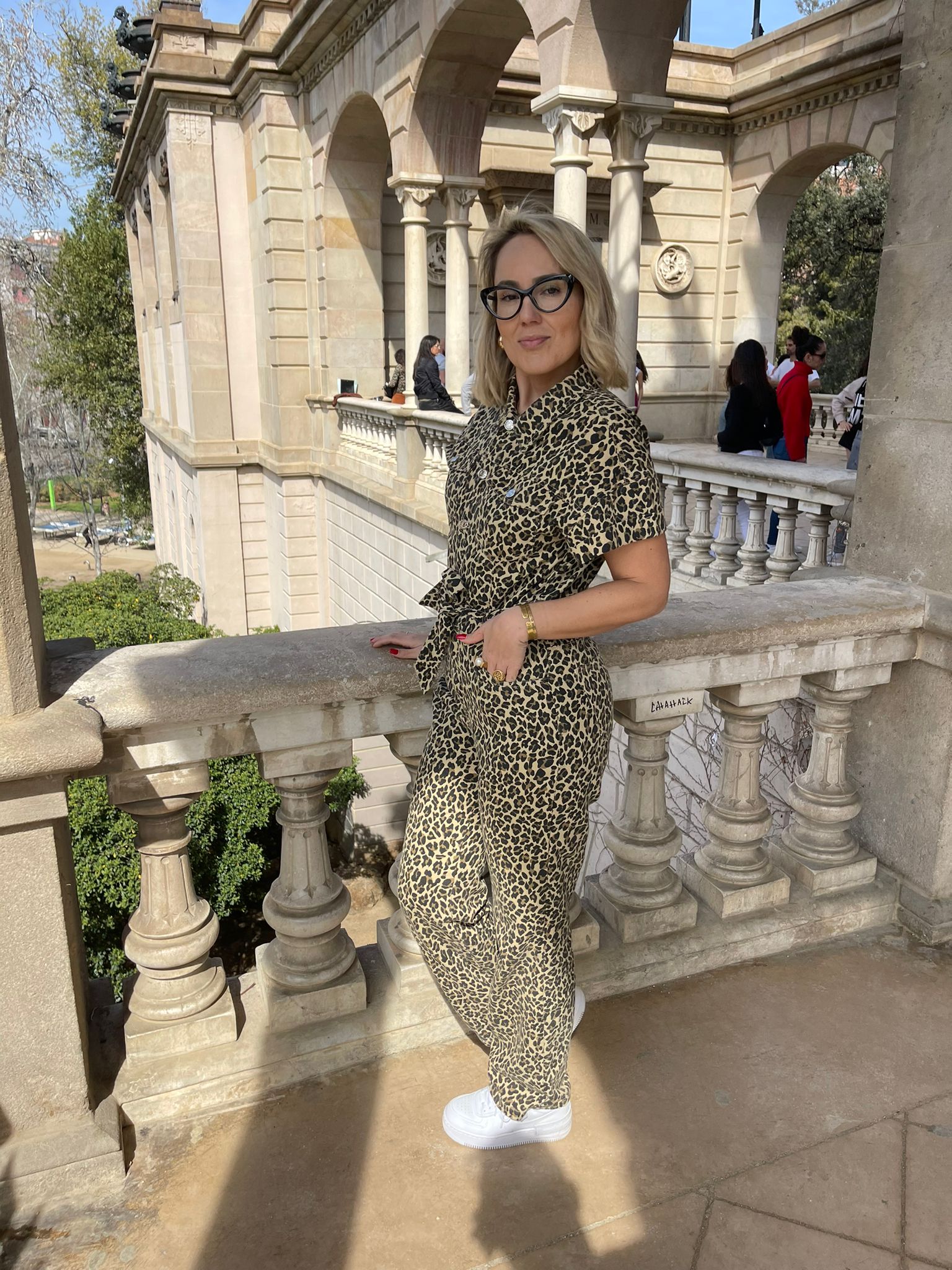 El cinturón a juego con el mismo estampado añade un toque de definición a la cintura, realzando la silueta. Las mangas son anchas y tienen un estilo tipo hombreras, lo que le da un toque de estructura y drama al conjunto.