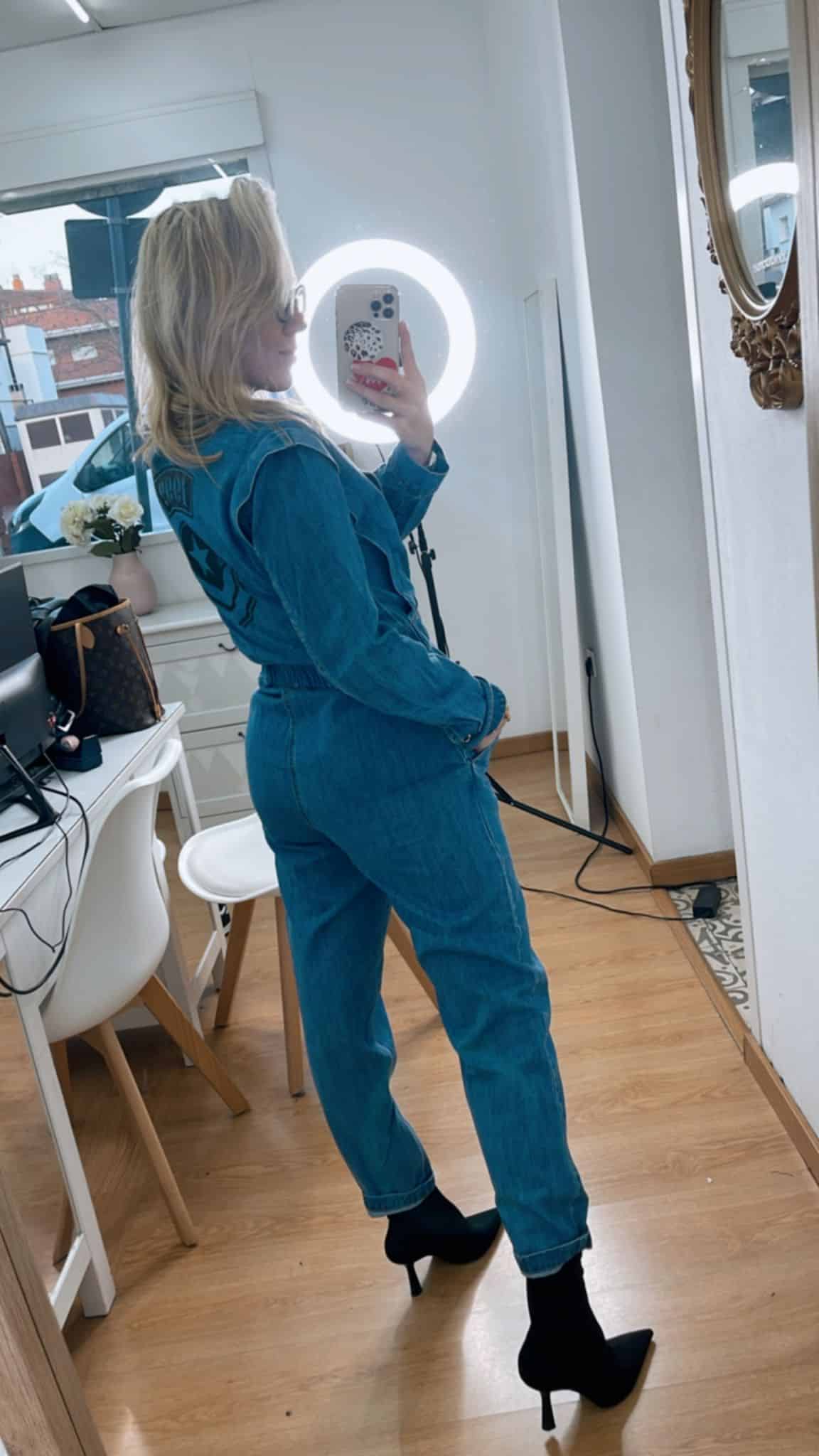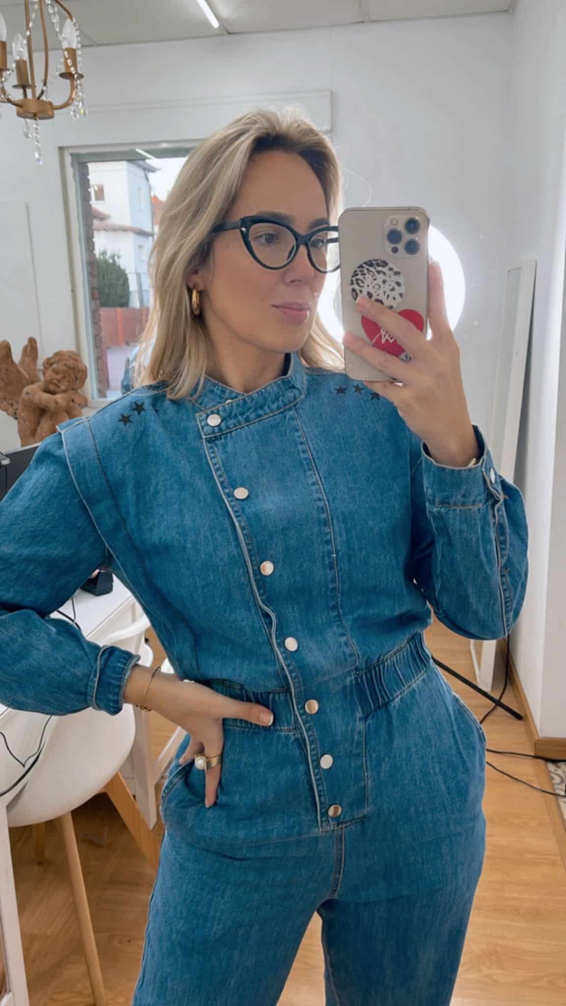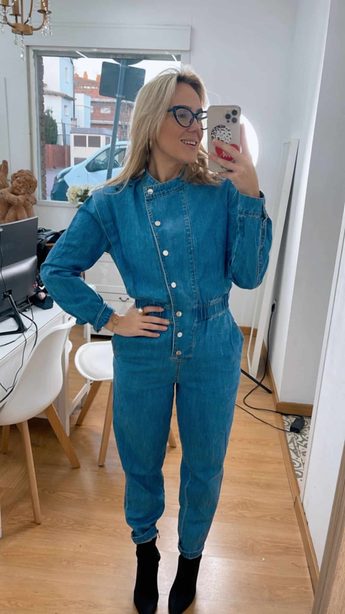 Ana lleva puesto la talla S, es 100% algodón y es un denim fino, no elástico, cede con el uso.
