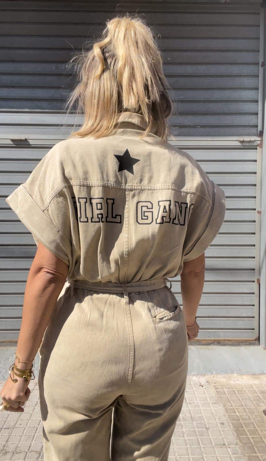Confeccionado con mangas oversize para mayor frescura, cuenta con una cremallera frontal para facilitar el ajuste y bolsillos prácticos para llevar tus objetos esenciales. El cinturón con cuerda ajustable añade un toque de versatilidad al conjunto. En la parte trasera, destaca el detalle “girl gang” que agrega un toque de personalidad y estilo único. Ideal para combinar con bambas o sandalias, este mono es una opción imprescindible para tus aventuras de verano.