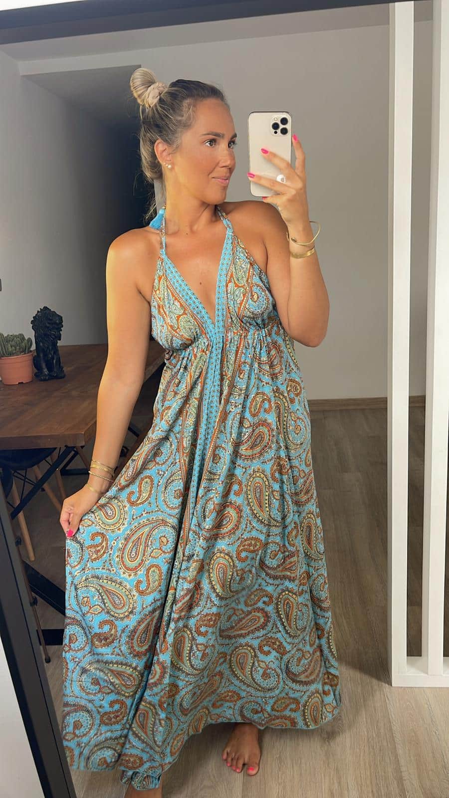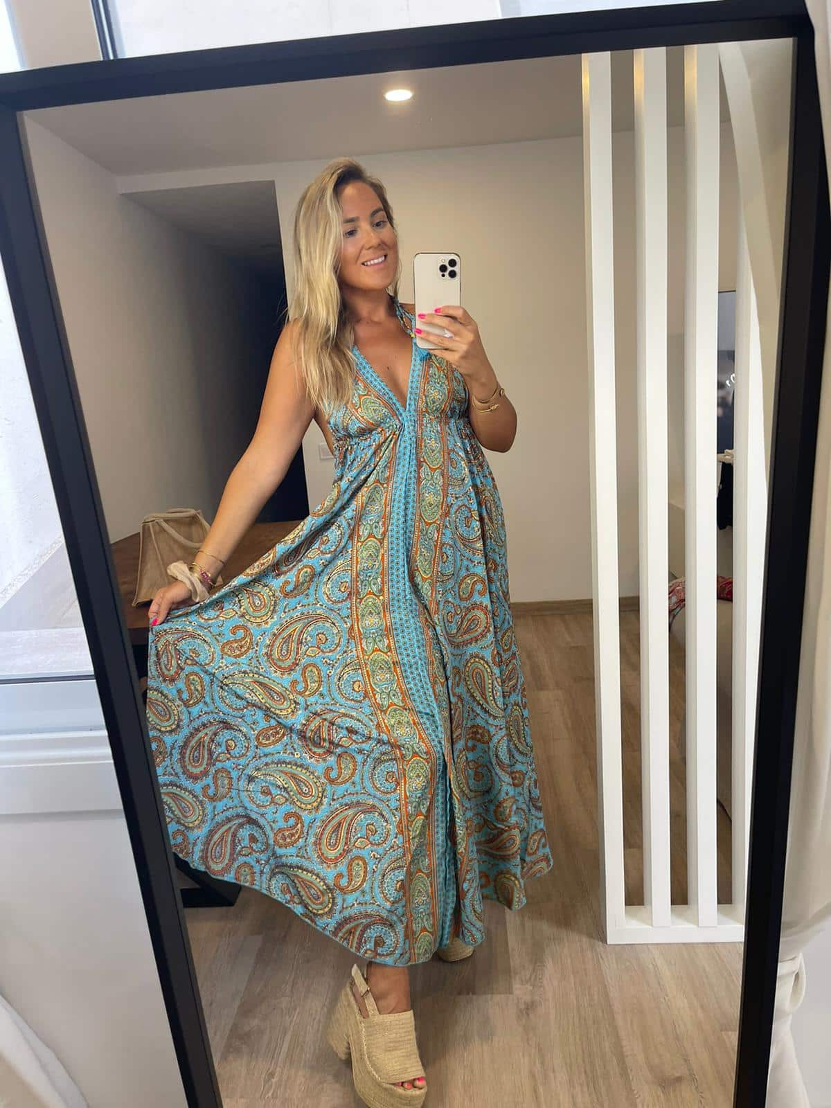 Vestido largo estampado de estilo boho. Atado al cuello y espalda descubierta.